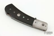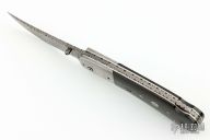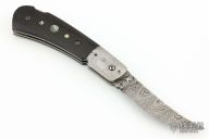 This linerlock folder from Doc Hagan features a Damascus Upswept blade with a fileworked blade spine with a single nail nick.  The handle features Damascus bolsters, African Blackwood scales over anodized titanium liners and fileworked Damascus backspacer. Abalone insets in the handle. Has some light scuffs, excellent condition otherwise.
