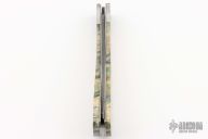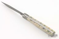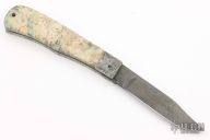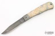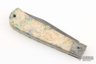 This slipjoint folder by Michael Tamboli features a Damascus blade. The handle has mosaic Damascus bolsters with green stone inlays, buckeye burl covers, stainless steel liners and spring. Has half-stop. Has some scuffs/scraches, otherwise good condition. Has some gaps between the liners and backspacer.
