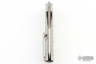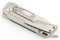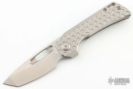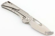 This Nymble Framelock Flipper by EMP EDC features a stonewashed blade with notched thumbrest and flipper, and a thumbhole. The handle has a stonewashed and milled titanium frame, backspacer, pivot collars and tip up clip. Comes with original box, papers and MokuTi hardware. Rides on bearings, nice detent, lockup and blade seating. Excellent condition. #031-098