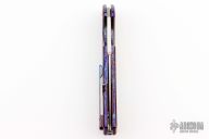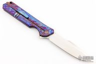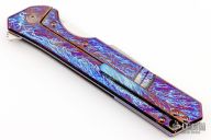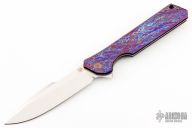 This Rainmaker by Olamic Cutlery features a satin finished blade with a notched flipper. The handle has an anodized titanium frame with matching titanium tip up pocket clip and an anodized titanium backspacer. Nice detent and lock up. Excellent condition. Comes with original zippered case and COA dated 6/21/15.