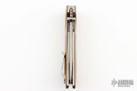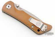 This Spider Monkey Linerlock folder by Southern Grind features a tumble finished drop point S35VN blade with dual thumb studs and a notched thumbrest. Handle has copper scales over titanium liners and barrel spacers, tumbled stainless steel tip up clip, and lanyard hole. Has some patina, otherwise excellent condition. Comes with original box and papers.
