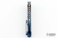 This Warhound flipper by Marfione Custom Knives features a bronzed two-tone stonewashed wharncliffe shaped, M390 blade with fullers and flipper. The handle has a Blue Galactic Acid Satin finished titanium frame with matching tip up clip, blue anodized titanium backspacer with lanyard hole, bronze anodized titanium pivot collars, lockface insert and overtravel stop screw. Rides on bearings, nice detent, lockup and blade seating. Comes with original box, zippered case and certificate of authenticity signed/dated 10/2018 and s/n 011. Excellent condition with no signs of use or carry.