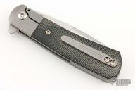 This Apache Front Flipper was designed by Enrique Pena, manufactured by Reate Knives and features Lee Williams Kickstop.  This knife features a satin finished blade with notched thumbrest and flipper tab.  The handle has titanium bolsters, black canvas micarta scales with a titanium backspacer and a titanium tip up pocket clip.  The knife opens with the use of Lee Williams' Kick Stop flipper.  Excellent Condition.  Comes with original box.