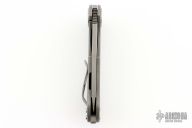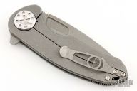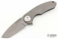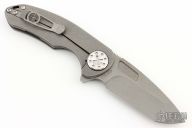 This F3 Medium by Curtiss Knives features a stonewashed blade with notched thumbrest and flipper. The handle has a tumbled titanium frame with a matching tip up titanium clip. Satin stainless hardware. Rides on bearings, nice detent and lockup.  Comes with original box, zipper case, COA, patch and sticker pack. Excellent condition.
