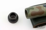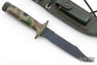This Survival Bowie by Valor features a black coated blade with sawteeth on the spine, .157" blade stock and 1.013" blade depth, hollow handle construction. The handle is camo coated aluminum with a knurled steel butt cap. Coems with a black leather sheath with sharpening stone. Has some scratches and wear on the coatings, otherwise excellent condition for its age.
