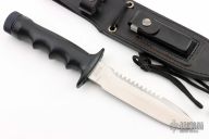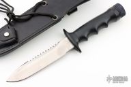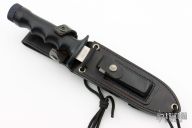 This vintage Commando knife by Life Knife features a satin finished blade with false top edge and sawteeth on the spine, .174" blade stock and 1.212" blade depth, hidden tang construction. The handle has a black aluminum guard with a black aluminum handle and removable butt cap with a compass. Has survival items in the handle. Comes with a black leather sheath and original box and papers. Has some light scuffs and scratches, excellent condition for it's age.
