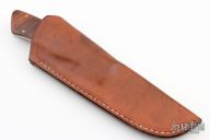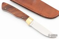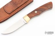 This knife by JD Clay features a satin finished blade with .128" blade stock and 1.121" blade depth, full tang construction. The handle has wood scales with brass pins and bolsters. Comes with a brown leather sheath. Has some light scratches, otherwise excellent condition.