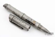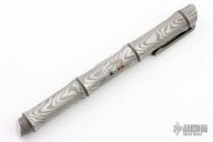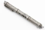 This Bamboo pen by Dmitry Streltsov is made from titanium with a Damascus motif. Comes with leather sheath and original packaging. The pen can be put together in three different configurations. The first it can just look like a piece of bamboo. Second, you can expose the pen. Third, you can expose the hidden spike end. Has a spring hinging clip. New from maker at the 2024 Blade Show Texas.