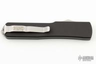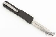 This UTX-70 OTF automatic by Microtech features a stonewash finished blade with a standard edges. The handle has a black aluminum frame with blasted stainless steel tip down clip. Serial number 14014 and dated 11/2010. Comes with original box and sheath. Excellent condition.