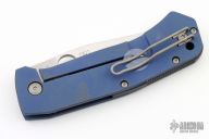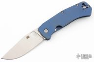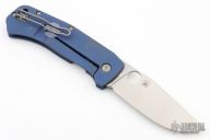 This Slysz Bowie by Spyderco features a satin finished blade with notched thumbrest and thumbhole. The handle has a blue anodized titanium frame with notched G-10 backspacer and tip up, left or right reversible clip. Nice detent, lockup and blade seating. Includes the original box, zippered case and papers.  Excellent condition.