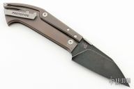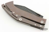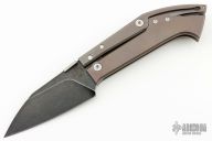 This Warthog by Max Knives and Torpen Knives features a black stonewashed blade with thumbdisc and notched thumbrest. The handle has an anodized and tumbled titanium frame, bead blasted titanium backspacer and tip up clip with hidden screws. This knife is a lockback with an interesting exposed spring. Comes with original velcro case. New from maker at the 2024 Blade Show Texas.