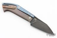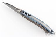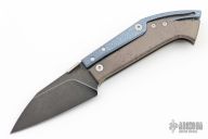 This Warthog by Max Knives and Torpen Knives features a black stonewashed blade with thumbdisc and notched thumbrest. The handle has a two-tone anodized and titanium frame, bead blasted titanium backspacer and tip up clip with hidden screws. This knife is a lockback with an interesting exposed spring. Comes with original velcro case. New from maker at the 2024 Blade Show Texas.