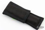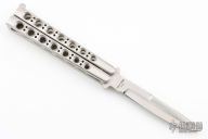 This early balisong from Pacific Cutlery features a Jody Samson ground satin finished blade with sharpened top edge. The handles are stainless steel with hole pattern. Has a few light scratches, otherwise excellent condition. Includes original nylon sheath.