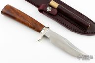 This Stanaback Special by Randall Made Knife features a satin finished blade with notched thumbrest and sharpened top edge, .219" blade stock and 1.129" blade depth, hidden tang construction. The handle has a nickel silver guard and butt plate, desert ironwood grip and black spacers. Comes with a maroon leather sheath and original paper wrapping. New from maker!