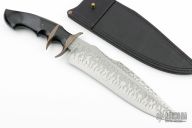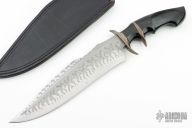 This Sub-Hilt Fighter by Jan Hafinec is beautiful. It features a recurve blade (C105 Carbon Steel) with amazing hamon and sharpened top edge, .255" blade stock and 2.226" blade depth, hidden tang construction. The handle has an antiqued bronze guard and sub-hilt with a black G-10 grip, stainless pin. Comes with a black leather sheath with brass rivets and belt stud. New from maker! The hamon on this knife looks like the fires of hell!  I love his work!