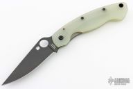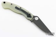 This Military Liner Lock by Spyderco has a black finished CPM-M4 stainless steel clip point blade with notched thumb rest and thumb hole. Handle is jade G10, with stainless steel single liner (lock), black stainless steel tip down clip, and lanyard tube pin. Comes with original box and papers. Has a couple very light scuffs, otherwise excellent condition.