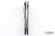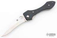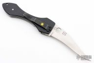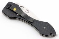 This Shabaria by Spyderco features a clip point recurved blade with thumb hole. The handle is comprised of carbon fiber scales over stainless steel liners and backspacer. Black coated stainless steel tip down clip. Includes original box and papers. Excellent condition.