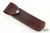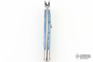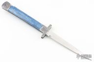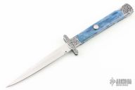 This Auto by Agasi Hambartsumian of Armenian Doctor Knives features a satin polished blade. The handle has engraved stainless steel bolsters, stainless steel liners, blue bone scales with brass pins, fileworked stainless steel backspacer. New from maker. Comes with a hand tooled brown leather sheath. This one has a little side to side blade play.
