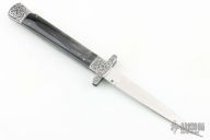 This Auto by Agasi Hambartsumian of Armenian Doctor Knives features a satin polished blade. The handle has engraved stainless steel bolsters, stainless steel liners, buffalo horn scales with brass pins, fileworked stainless steel backspacer. New from maker. Comes with a hand tooled brown leather sheath. This one has a little side to side blade play.