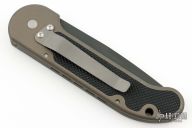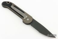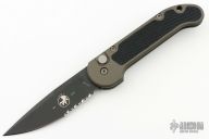 This LUDT side opening automatic by Microtech Knives has a black finished partially serrated blade. The handle has a dark bronze anodized aluminum frame with rubber inserts, with tip down stainless steel clip. Dated 3/97, S/N 129. Excellent condition. Comes with original gold box and papers.