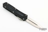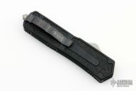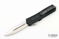This Scarab OTF auto by Microtech has a satin double edged blade with fullers. The handle is black aluminum with blasted fittings, single glass breaker, tip down black stainless steel clip. #0440 and dated 01/2005. Includes original sheath, paperwork, and box. Excellent Condition.