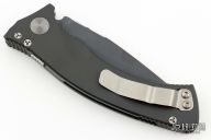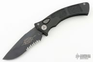 This Amphibian Auto has a DLC clip point recurve partially serrated blade. Handle is black aluminum with nonslip inserts and bead blasted stainless steel tip up clip. S/N #1474. Dated 03/2004. Includes original box, papers and nylon sheath. Excellent Condition.
