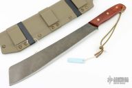 This “regular” length Latin style machete (13.5 in. blade and 19 in. total length) featurse 8670 steel that is sourced from BESTAR Germany, .120 thickness and are 56-57 HRC. The blades have a forced patina, are stonewashed, and have Machete Masters and 8670 etched on the blade. Convex grind on the blade, the back spine of the machetes are filed flat (for scraping wood) and I round the top (for a handhold). The handle has Quina Colorada wood scales with brass Loveless bolts and a flared brass lanyard tube. Custom taco style sheath made of .093 KYDEX, brass Chicago screws, and a brass Sam Browne stud button to hook the lanyard. Comes with COA. New from maker!