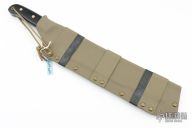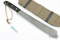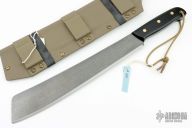 This “regular” length Latin style machete (13.5 in. blade and 19 in. total length) featurse 8670 steel that is sourced from BESTAR Germany, .120 thickness and are 56-57 HRC. The blades have a forced patina, are stonewashed, and have Machete Masters and 8670 etched on the blade. Convex grind on the blade, the back spine of the machetes are filed flat (for scraping wood) and I round the top (for a handhold). The handle has black canvas micarta scales with brass Loveless bolts and a flared brass lanyard tube. Custom taco style sheath made of .093 KYDEX, brass Chicago screws, and a brass Sam Browne stud button to hook the lanyard. Comes with COA. New from maker!