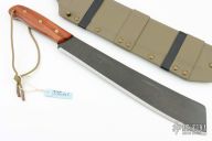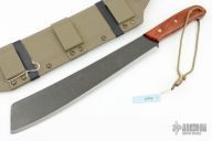 This “regular” length Latin style machete (13.5 in. blade and 19 in. total length) features 8670 steel that is sourced from BESTAR Germany, .120 thickness and are 56-57 HRC. The blades have a forced patina, are stonewashed, and have Machete Masters and 8670 etched on the blade. Convex grind on the blade, the back spine of the machetes are filed flat (for scraping wood) and I round the top (for a handhold). The handle has Curupau wood scales with brass Loveless bolts and a flared brass lanyard tube. Custom taco style sheath made of .093 KYDEX, brass Chicago screws, and a brass Sam Browne stud button to hook the lanyard. Comes with COA. New from maker!