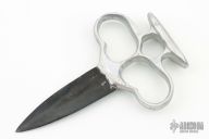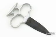 This "Robbins Dudley Style" Push Dagger by Plowshare Forge features a black double edged blade with an aluminum knuckle handle. A little rough, but I think it is intended to be.