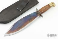 This OSS Commando Smatchet by Plowshare Forge features a hand forged blade with false top edge, .179" blade stock and 2.793" blade depth, hidden/mortise tang construction. The handle has a steel guard, dark wood scales and steel pins, brass butt. Comes with a black leather covered wooden sheath. Has a rustic look, otherwise excellent condition since it was intended to look this way.