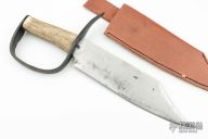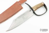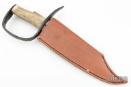 This Johnny Reb Bowie by Plowshare Forge features a hand forged blade with false top edge, .229" blade stock and 2.558" blade depth, hidden tang construction. The handle has a black steel guard and a stag grip. Comes with a brown leather sheath. Has a rustic look, otherwise excellent condition since it was intended to look this way.