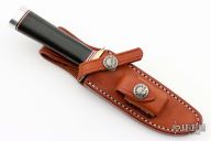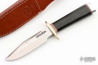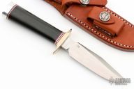 This is a miniature Model 1 - with all the features of the famous WWII full size Model 1. Stainless steel blade with top edge sharpened approximately 1 3/4 inches back from the tip, .166" blade stock and .833" blade depth, hidden tang construction. The handle has a nickel silver double guard, duralumin butt, and a black linen micarta grip with red/white/blue spacers. Comes with a brown leather sheath. In addition, the knife is authenticated by a coded transponder which cannot be altered. The transponder is inserted into the handle during construction with an encoded serial number matching the etched number on the blade. Only 1500 made. Serial number 179. Excellent condition. Comes with a zippered case.