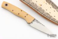 This Shank by Fiddleback Forge features a drop point blade with .122" blade Stock, 1.088" blade depth, full tapered tang construction. The handle has linen micarta scales, white G-10 and brown canvas micarta liners, brown canvas micarta pins and a lanyard tube. Comes with custom sheath. Excellent condition.
