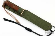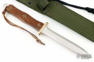 This Gunner Model by EK knives is a limited edition of 500, this one being #047. It features a satin finished double edged blade. The handle is checkered wood with the brass "X" head bolts. Brass double guard Full tang construction with thickness of .150" and depth of 1". Tang extends 3/4" at the butt with a lanyard hole. Includes a green nylon sheath. Has some light scratches, otherwise excellent condition. The serial number is engraved just below the logo. You can just barely see it in the pictures if you zoom in.