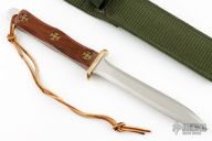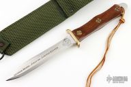 This Gunner Model by EK knives is a limited edition of 500, this one being #048. It features a satin finished double edged blade. The handle is checkered wood with the brass "X" head bolts. Brass double guard Full tang construction with thickness of .150" and depth of 1". Tang extends 3/4" at the butt with a lanyard hole. Includes a green nylon sheath. Has some light scratches, otherwise excellent condition. The serial number is engraved just below the logo. You can just barely see it in the pictures if you zoom in.