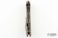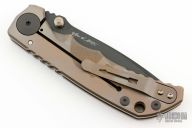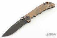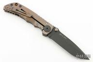 This Harsey framelock folder by Spartan Blades features a black drop point blade with dual thumbstuds and a notched thumbrest. The handle has a bronze anodized titanium frame with a laser engraving a tip up titanium clip and filler tab. Has nice detent, lockup, and blade seating. Excellent condition. Comes with original box.