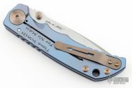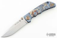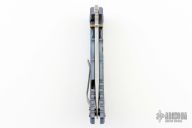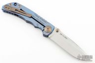 This Harsey framelock folder by Spartan Blades features a stonewash finished drop point blade with dual thumbstuds and a notched thumbrest. The handle has an anodized titanium frame with a laser engraving a tip up titanium clip and filler tab. Has nice detent, lockup, and blade seating. Excellent condition. Comes with original box.