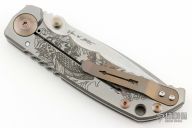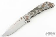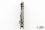 This Harsey framelock folder by Spartan Blades features a stonewash finished drop point blade with dual thumbstuds and a notched thumbrest. The handle has an anodized titanium frame with a laser engraving a tip up titanium clip and filler tab. Has nice detent, lockup, and blade seating. Excellent condition. Comes with original box.