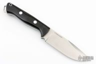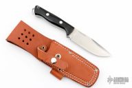 This Bravo Squad Leader by Bark River Knives features a satin finished clip point blade with fullers, .217" blade stock and 1.339" blade depth, full tang construction. The handle has black canvas micarta scales with a lanyard hole at the butt. Comes with brown leather sheath and original box. Excellent condition.