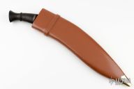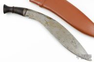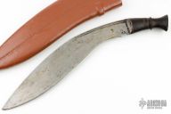 This Gurkha Kukri has a hand forged recurve blade with small fullers, .374" blade stock and 2.778" blade depth, hidden tang construction. Handle has steel bolsters and a carved wood grip. Has scratches and oxidation, otherwise good condition for its age. The spine of the blade is engraved, not sure what it means. The consigner said he though it was from the 1800s. Comes with a reproduction sheath.