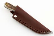 This knife by LT Wright features a satin finished flat ground blade with .119" blade stock and .831" blade depth, full tang construction. The handle has stag scales with brass pins. Comes with original box and brown leather sheath. Excellent condition.