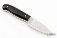 This knife by LT Wright features a satin finished flat ground blade with .184" blade stock and .8393" blade depth, full tang construction. The handle has black micarta scales with red liners and brass pins. Comes with original box and brown leather sheath. Excellent condition.