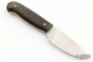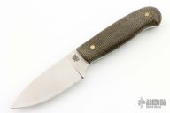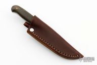 This knife by LT Wright features a satin finished flat ground blade with .119" blade stock and .902" blade depth, full tang construction. The handle has green micarta scales with brass pins. Comes with original box and brown leather sheath. Excellent condition.
