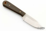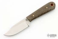This knife by LT Wright features a satin finished flat ground blade with .122" blade stock and .87" blade depth, full tang construction. The handle has green micarta scales with brass pins. Comes with original box and brown leather sheath. Excellent condition.