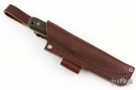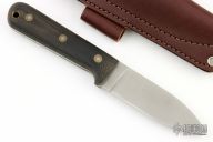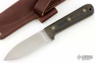 This knife by LT Wright features a satin finished flat ground blade with .119" blade stock and 1.218" blade depth, full tang construction. The handle has green micarta scales with corby bolts. Comes with original box and brown leather sheath. Excellent condition.