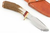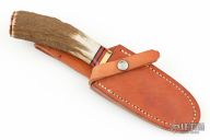 This Hunter by Enedino De Leon features a satin finish blade with a false top edge, .215" blade stock and 1.310" blade depth, hidden tang construction. The handle has a brass guard and butt, stag grip with black/red spacers. Includes a brown leather sheath. Excellent condition.
