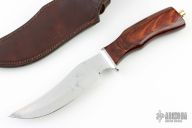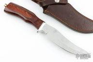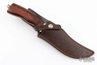 This knife from Colt features mirror polished blade with integral guard, .280" blade stock and 1.329" blade depth, hidden tang construction. The handle has a dymondwood grip with a brass tang nut with lanyard hole. Comes with a brown leather sheath. Has some patina and light scratches, otherwise good condition.
