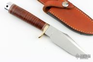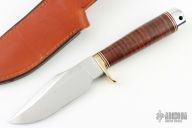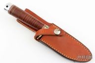 This Classic Blades Trail Guide from Blackjack Knives features a satin finish clip point blade with false top edge, .213" blade stock and 1.397" blade depth, hidden tang construction. The handle has brass guard with red, white and black spacers, stacked leather handle and an aluminum butt. Includes a brown leather sheath. Has some light scratches and patina, otherwise good condition.