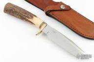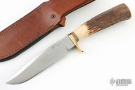 This Classic Blades Skinner from Blackjack Knives features a satin finished blade with false top edge, .214" blade stock and 1.148" blade depth, hidden tang construction. The handle has a brass guard with red, white and black spacers and a stag grip. Includes a brown leather sheath with belt loop. Has a couple light scratches, otherwise excellent condition.